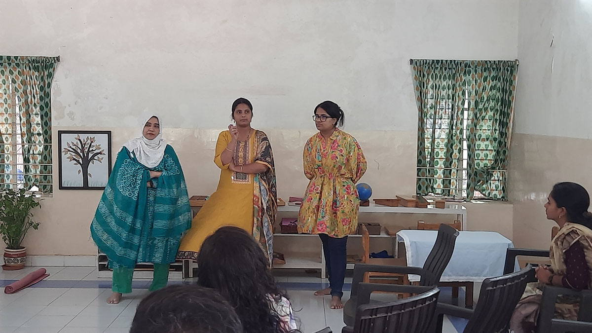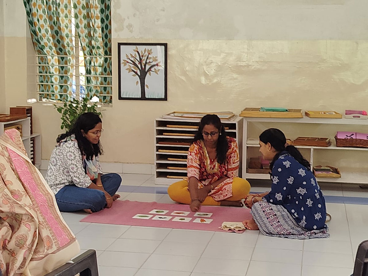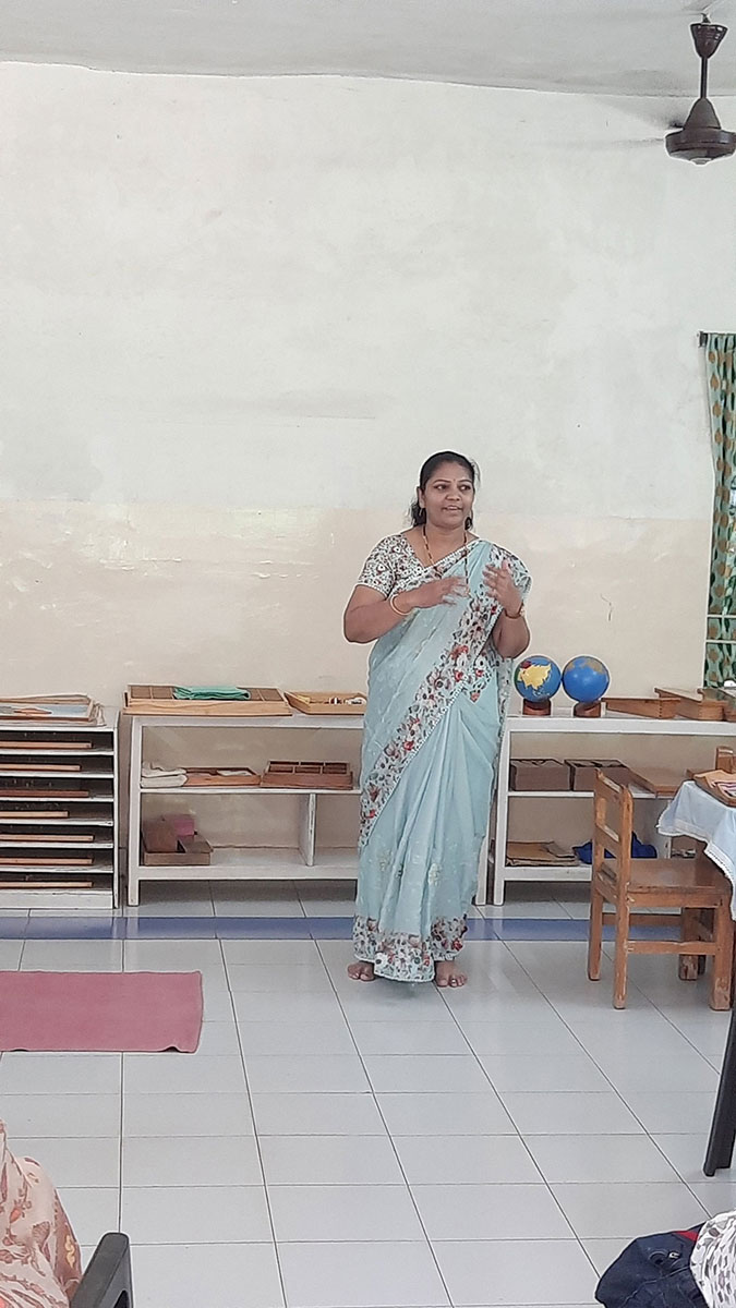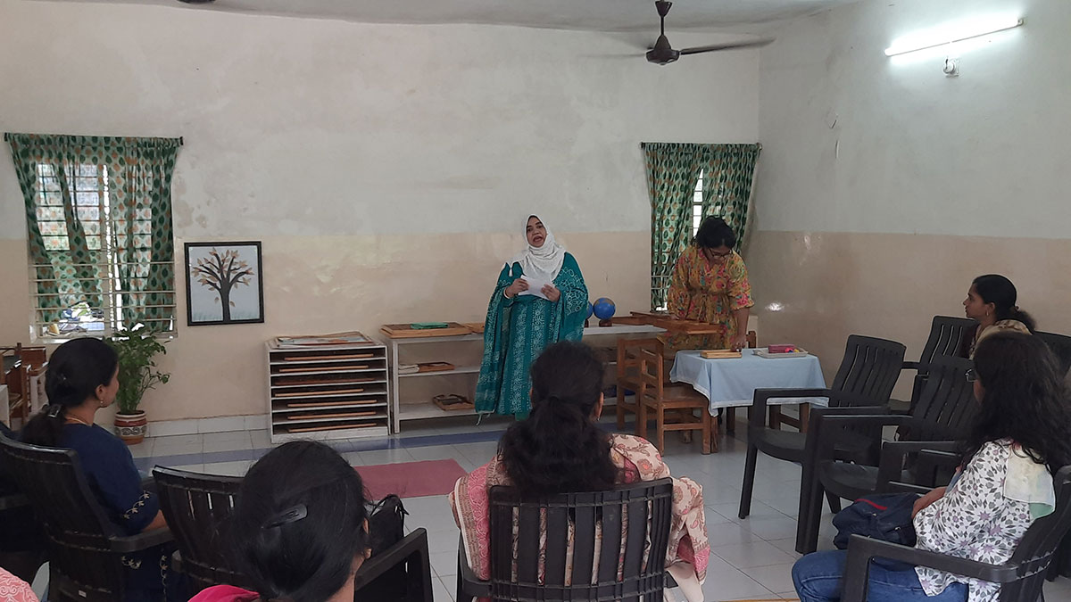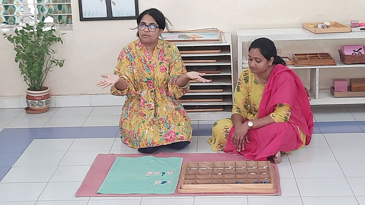 The workshop began by highlighting how spoken language, forms the base for all later reading and writing skills. Teachers demonstrated activities that help children build vocabulary and expression, such as classified picture cards, object-naming exercises, story-telling, sound games, and conversation time. Participants then explored the progression from spoken language to written language through Sandpaper Letters, Moveable Alphabets, materials that help children connect sounds with symbols, develop fine motor control, and express their thoughts in written form.