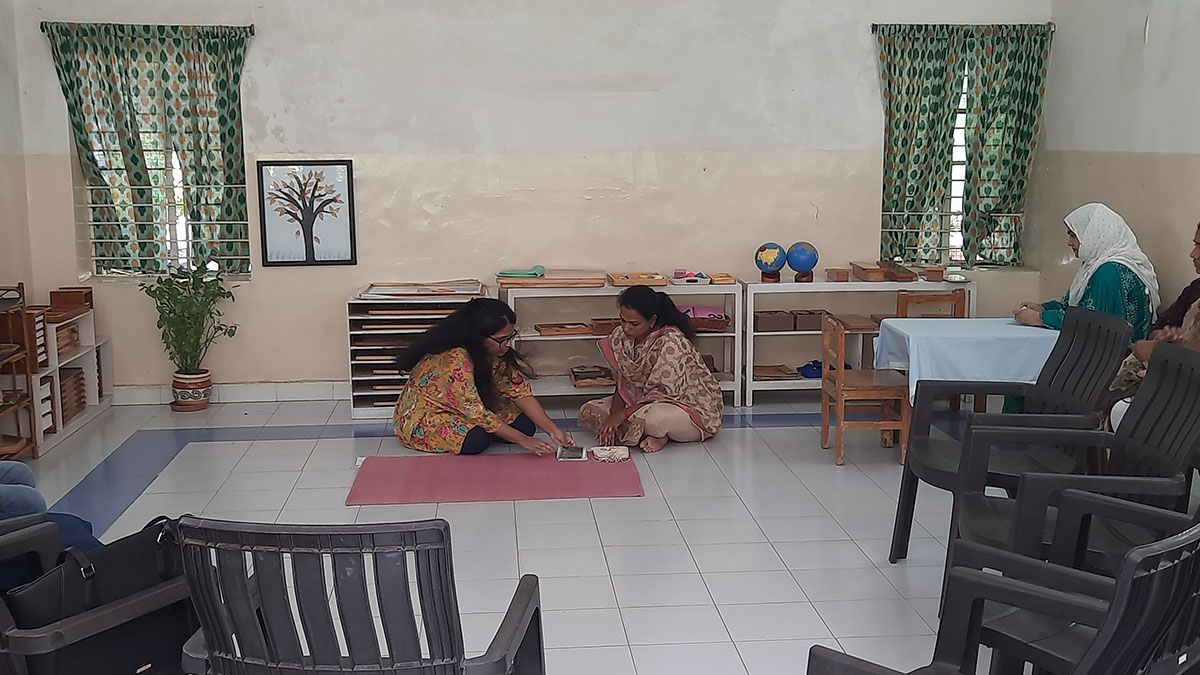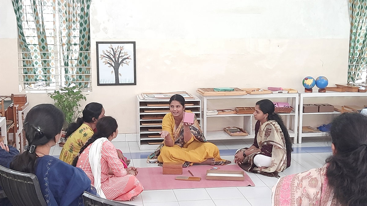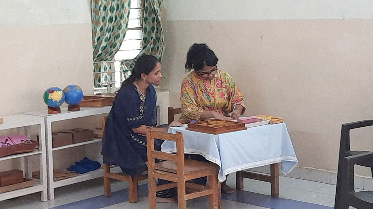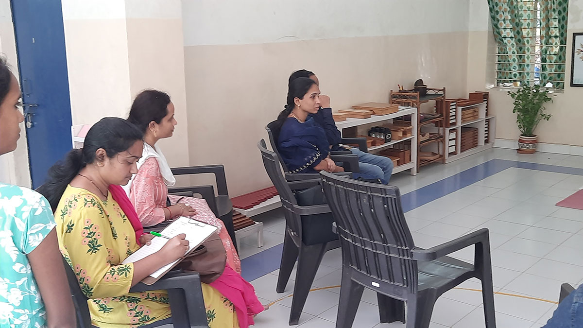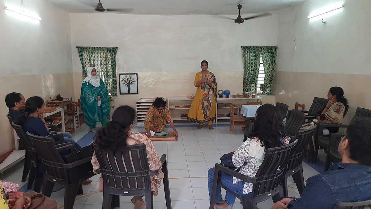 The workshop began by highlighting how spoken language, forms the base for all later reading and writing skills. Teachers demonstrated activities that help children build vocabulary and expression, such as classified picture cards, object-naming exercises, story-telling, sound games, and conversation time. Participants then explored the progression from spoken language to written language through Sandpaper Letters, Moveable Alphabets, materials that help children connect sounds with symbols, develop fine motor control, and express their thoughts in written form.