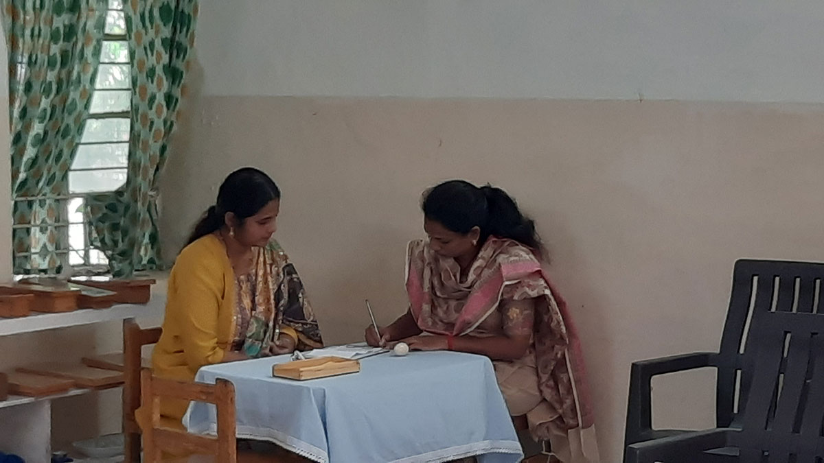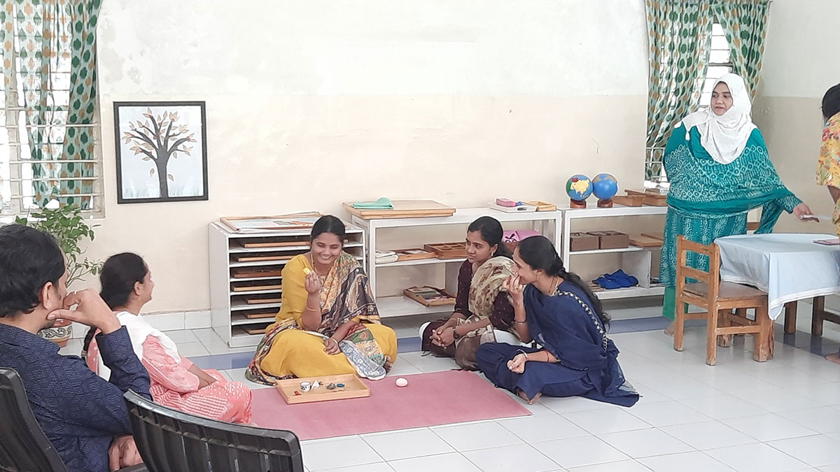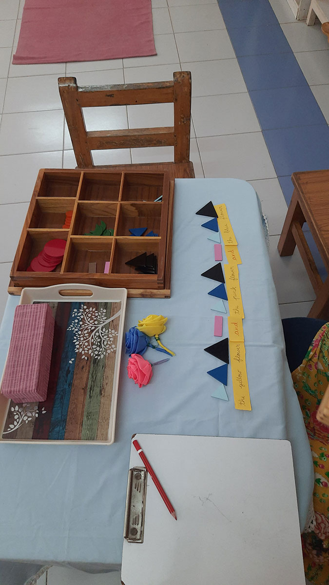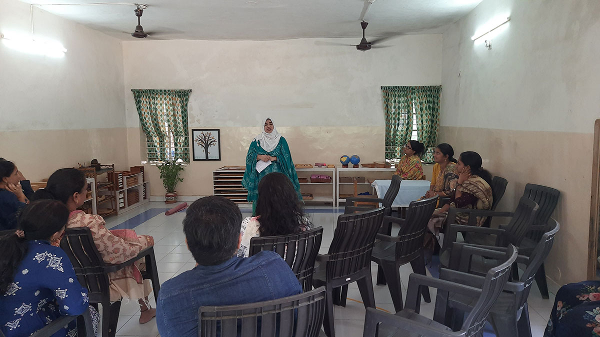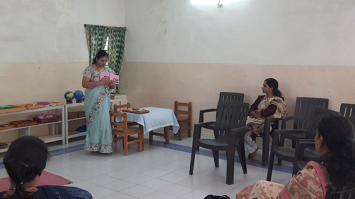The workshop began by highlighting how spoken language, forms the base for all later reading and writing skills. Teachers demonstrated activities that help children build vocabulary and expression, such as classified picture cards, object-naming exercises, story-telling, sound games, and conversation time. Participants then explored the progression from spoken language to written language through Sandpaper Letters, Moveable Alphabets, materials that help children connect sounds with symbols, develop fine motor control, and express their thoughts in written form.