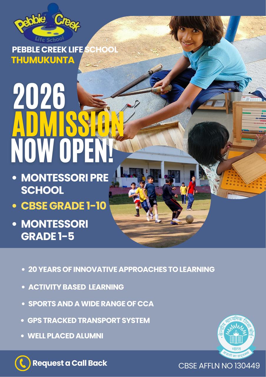 Welcome to Pebble Creek Life School, Thumkunta. Hyderabad’s only Montessori school affiliated to CBSE.