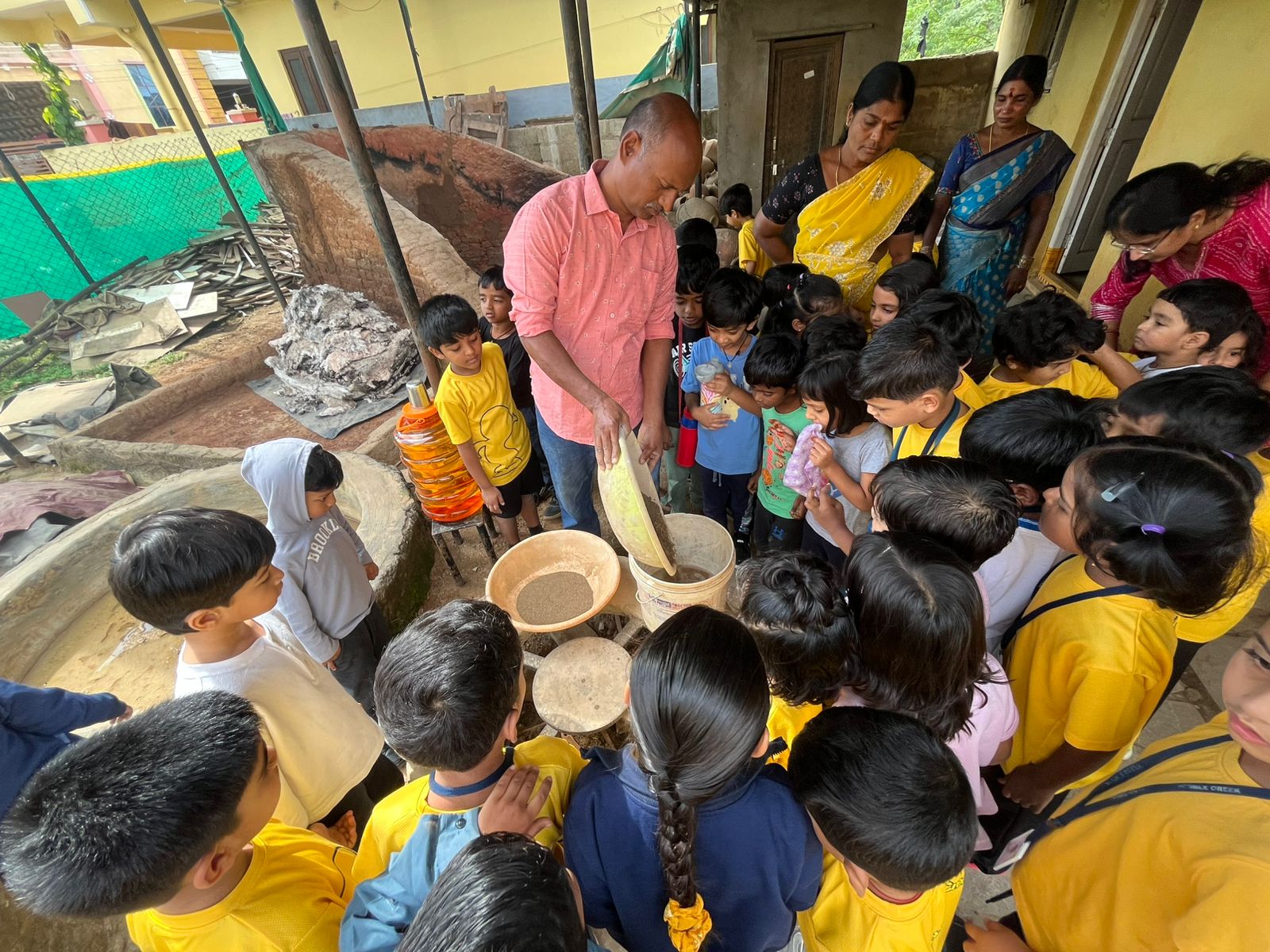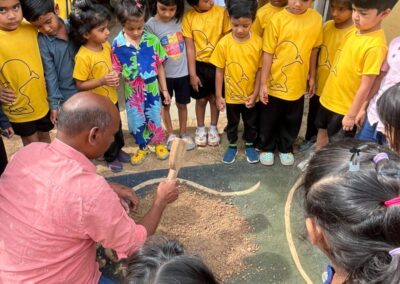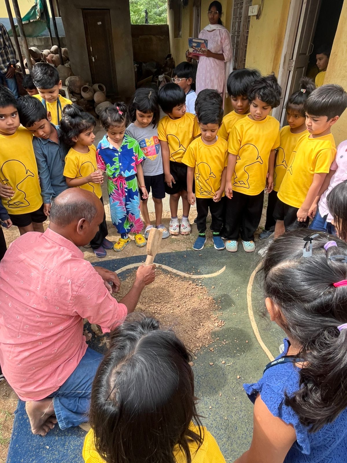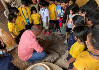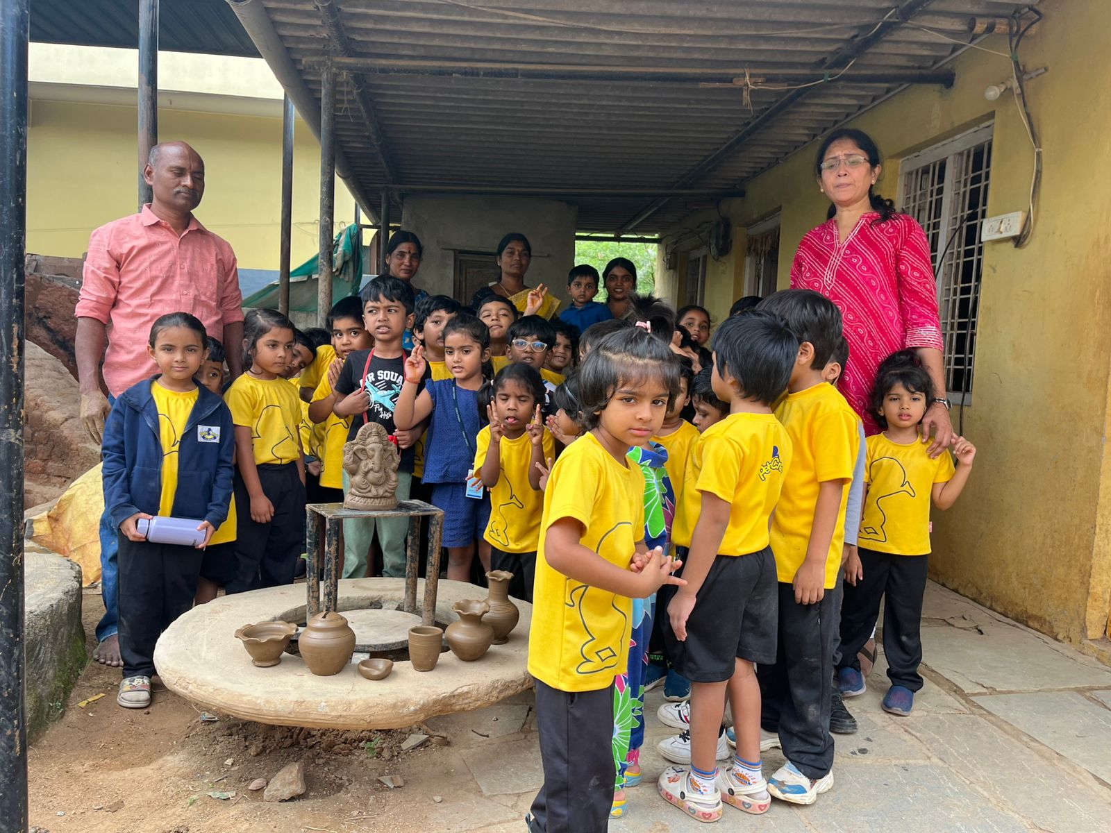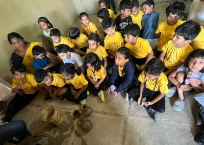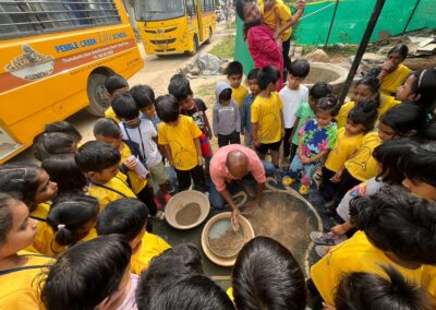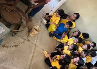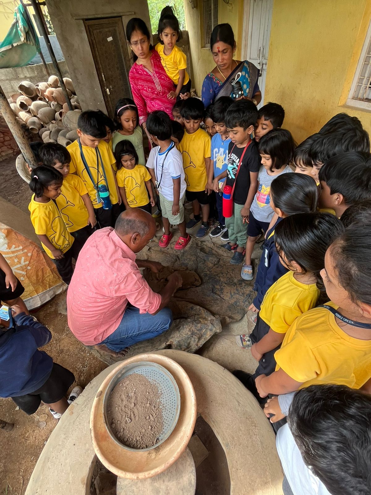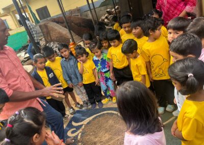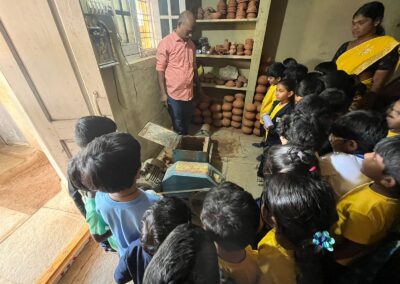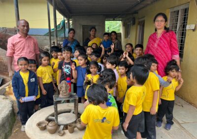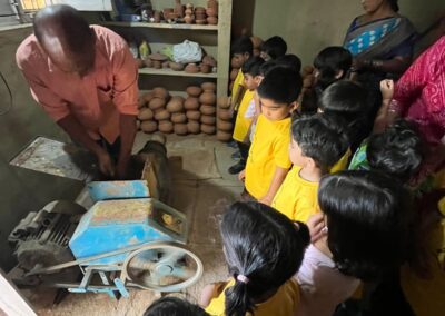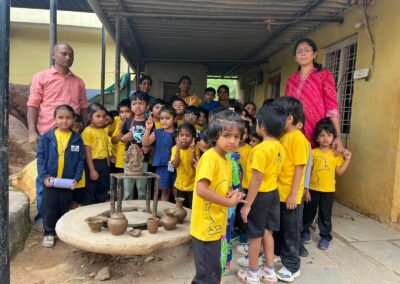 Our Primary Montessori children went on an exciting visit to a pottery craft centre on 10th October 2025. The instructor demonstrated how raw mud is collected and softened by hitting it, then strained to remove impurities. It is then mixed with water and left for a few minutes to become smooth and workable. The softened mud is placed into a machine that turns it into fine clay, ready to be used for making idols, pots, and other clay items. The children observed how the clay is placed on the potter’s wheel and how different shapes can be formed by skillfully using hands while the wheel spins. The instructor also showed them an old oven used for baking the clay items after they dry, which makes them strong and durable. He explained that these baked clay products can be used for making flower vases, storing drinking water, and even for cooking. The children learned that clay is one of the earliest and most important inventions of human civilization.
